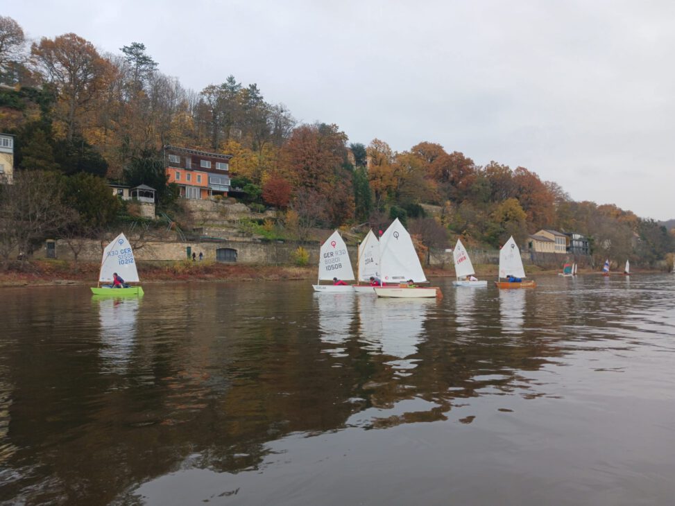 So standen dann am 09. November am zeitigen Vormittag 17 aufgeriggte Optis auf der Wachwitzer Elbwiese und warteten auf das Startsignal. Gegen 10:30 war es dann soweit: Nach der Steuermannsbesprechung gingen alle Optis aufs Wasser. Das Treiben stromab konnte beginnen. So wenig Wind wie dieses Jahr hatten wir lange nicht. So kam es diesmal besonders auf die Fahrt in der Flussmitte an, wo die Strömung am größten ist.