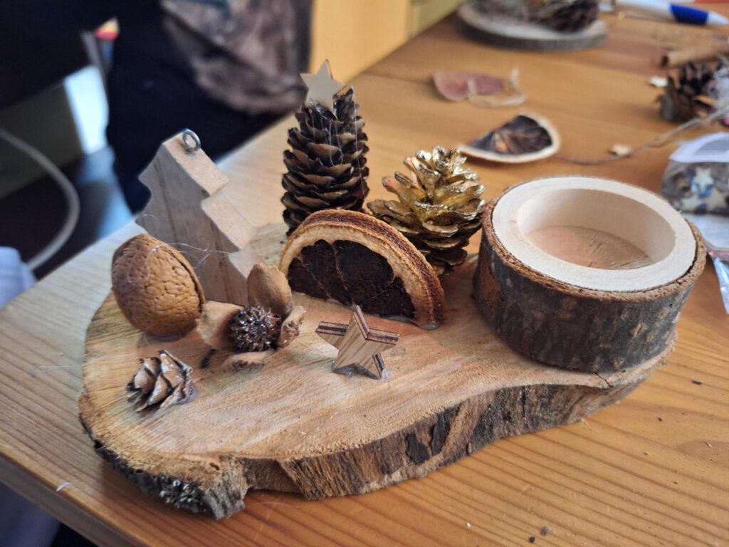 Es entstanden unter anderem maritime Knotentafeln, Topfuntersetzer, Christbaumschmuck und weihnachtlich dekorierte Baumscheiben mit Kerzen.